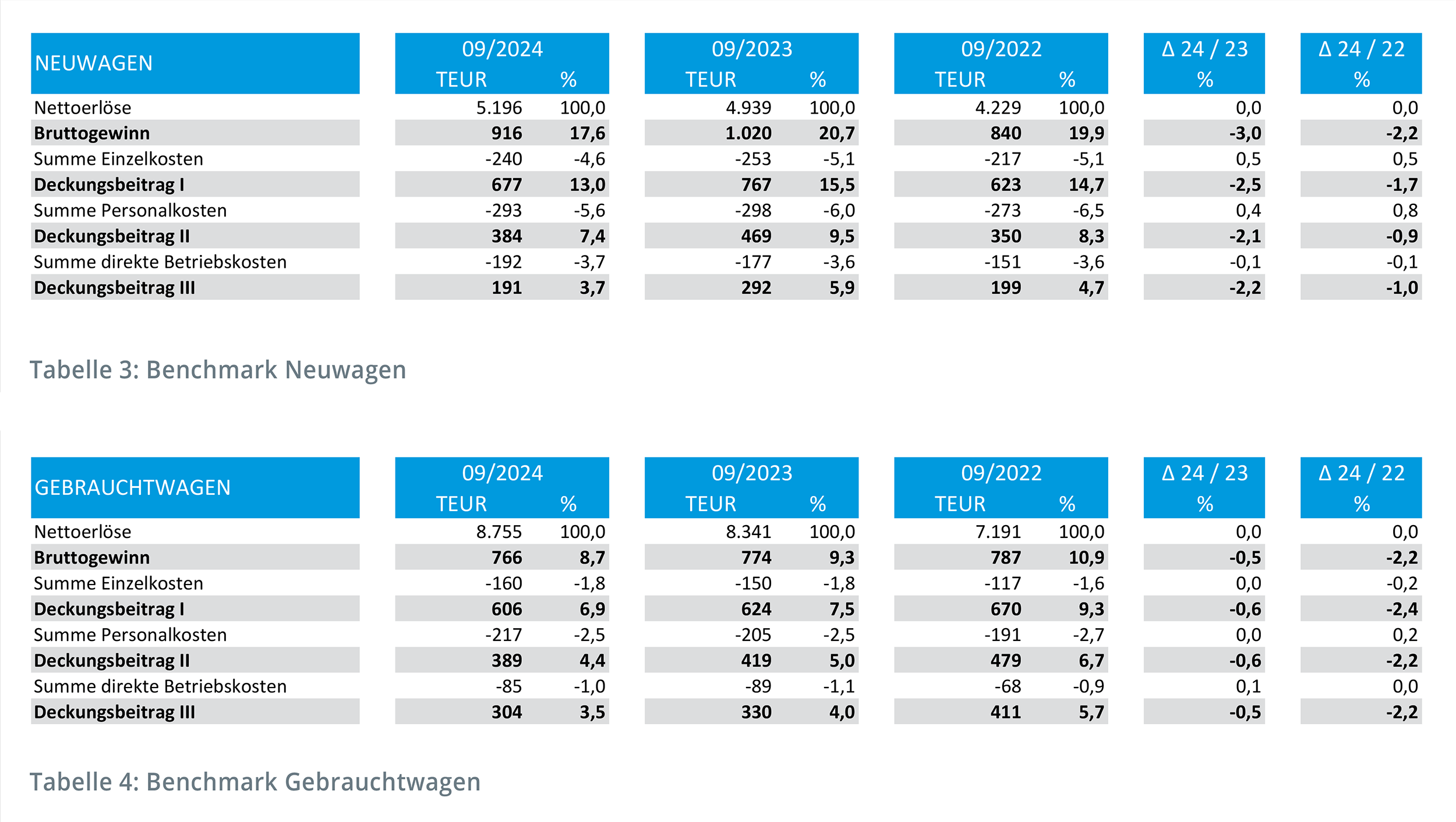 Mit der Benchmark-Auswertung für das dritte Quartal 2024 zeigt sich immer mehr die Normalisierung im Geschäftsbetrieb nach den beiden Ausnahmejahren 2022 und 2023, sowohl in der Ergebnislage als auch bei den Deckungsbeitrags-Anteilen.