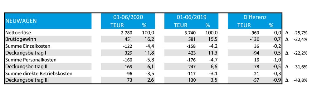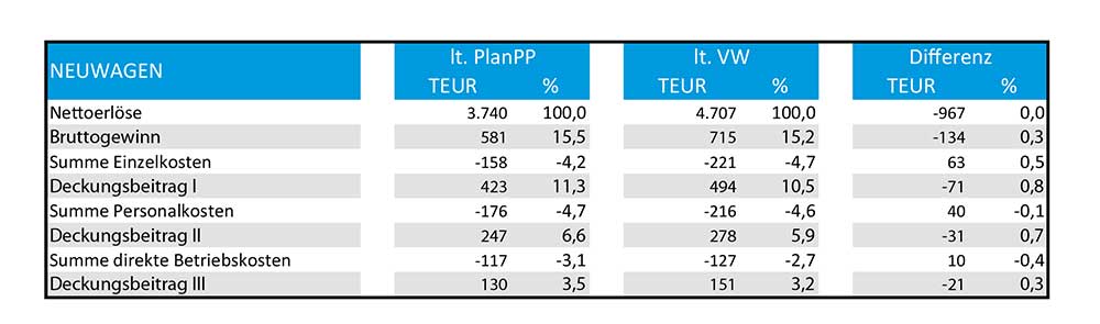 Um einen ersten glaubwürdigen Vergleichsmaßstab zu erhalten, wurde eine Auswertung für das erste Halbjahr 2019 vorgenommen. Die auf diese Art und Weise gewonnenen Erkenntnisse wurden dann mit den letzten Ergebnissen des Management-Business-Reports für die VW-Händler für den gleichen Zeitraum verglichen. Sowohl auf der Ebene des Rechtsträgers als auch auf der Ebene der Kostenstellenbereiche konnte in fast allen Stufen der Autohaus-BWA ein hohes Maß an Übereinstimmung für das erste Halbjahr 2019 erzielt werden. Als Beispiel sei auf die Kostenstelle Neuwagen und deren Ergebnisse hingewiesen.